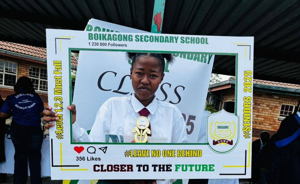 • Boikagong learners excel despite overcrowding, with 108 in one class and four sharing each desk.