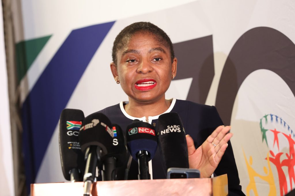 Minister in the Presidency Khumbudzo Ntshavheni addressing the media in Pretoria. Picture: GCIS